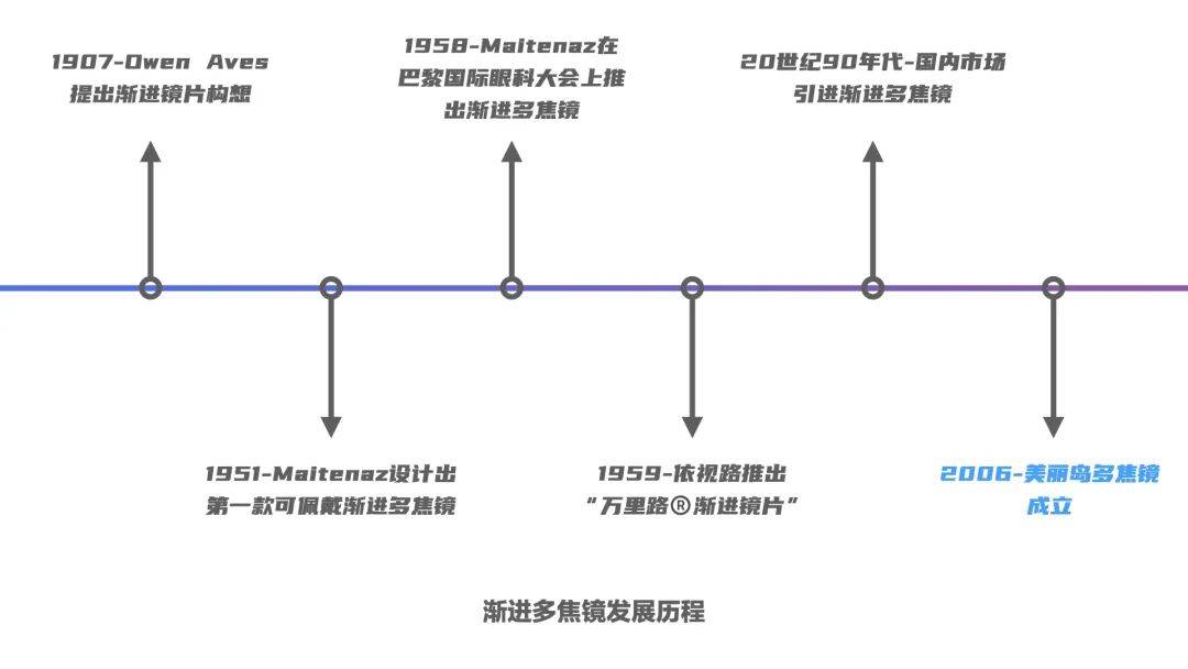 多焦鏡構(gòu)思發(fā)端于1907年美國人歐文·阿維茲。1951年,梅特納茲經(jīng)過8年研究,設(shè)計出第一款可用于臨床佩戴的漸進多焦鏡。1958年,漸進多焦鏡在巴黎眼科國際大會上推出后,立即受到市場熱捧。1959年,在梅特納茲主持下,依視路推出了萬里路?漸進鏡片。