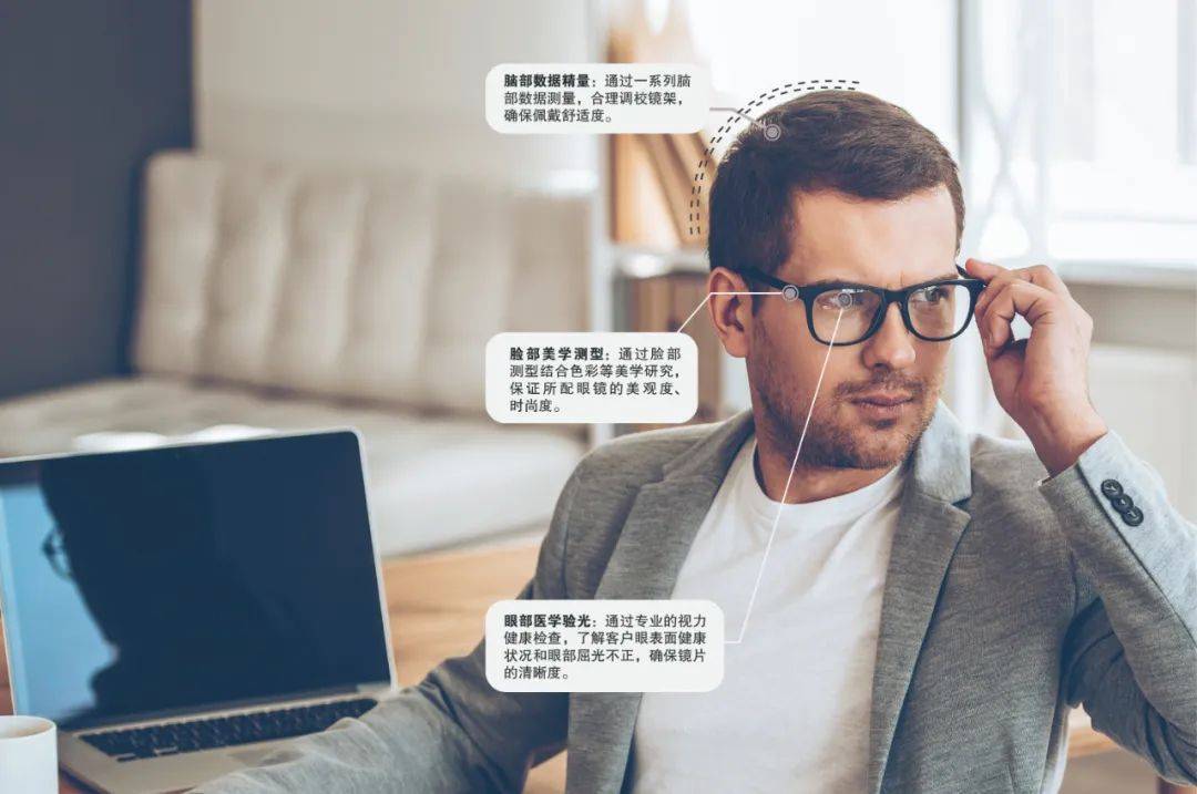 腦部數(shù)據(jù)精量,通過測量耳頂距離、耳眼距離、眼頂距離、瞳距等參數(shù),確定鏡片及鏡架的尺寸型號,為客戶制作一副佩戴完美的多焦鏡。