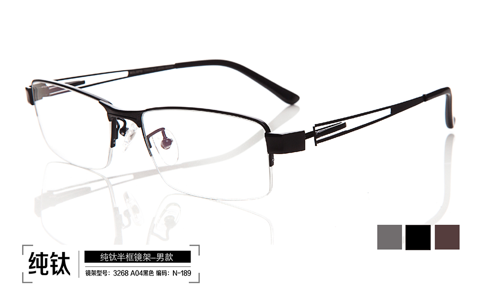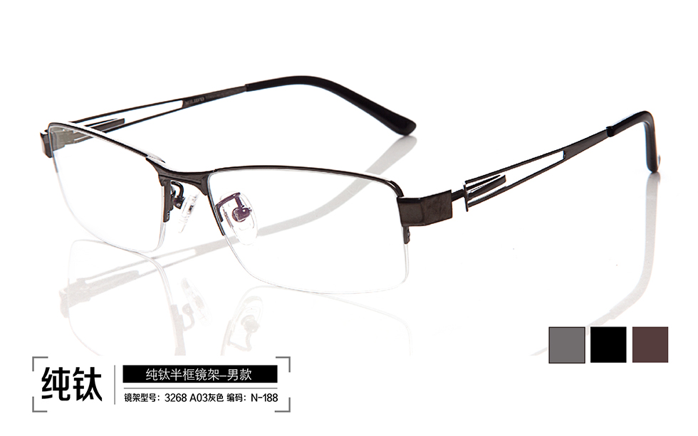 鏡架系列: 鈦金屬半框鏡架 名稱: 鈦金屬半框鏡架 型號:3268 A03灰色;3268 A04黑色;3268 A13古銅色 編號:N-188;N-189;N-190 |